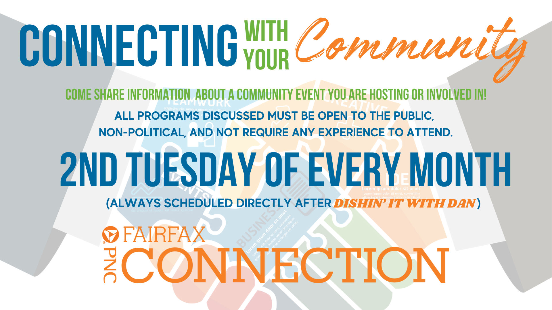 Bring your ideas and har about upcoming workshops and events during this time to chat with Dan Roberson, executive director of the PNC Fairfax Connection.