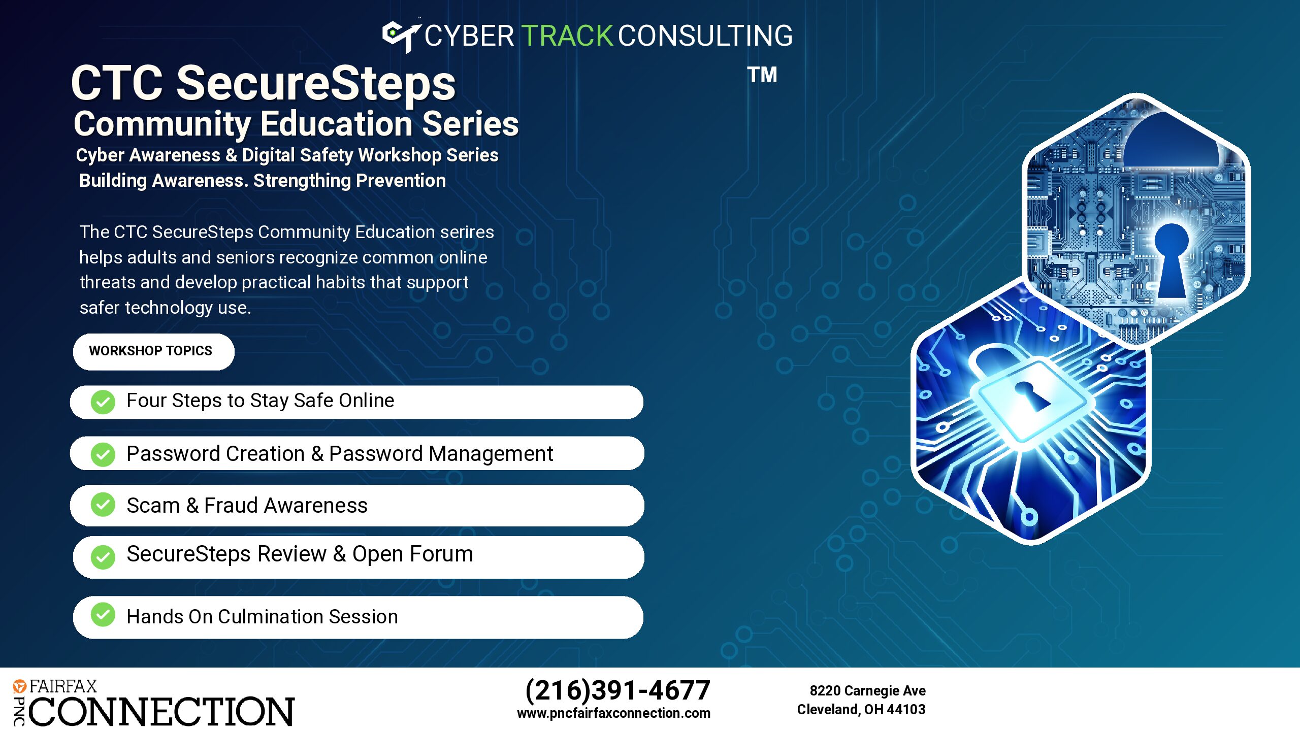 The CTC SecureSteps Community Education series helps adults and seniors recognize common onloine threats and develop practical habits that support safer technology use.