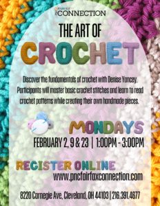 Learn the fundamentals of crochet. Participants will learn basic crochet stitches and how to read a crochet pattern while creating their own crocheted pieces.