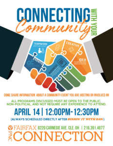 Join us to hear about community events and prepare to share. All programs discussed must be open to the public, be non-political and not require any experience to attend. This session will commence directly after Dishin’ It with Dan.