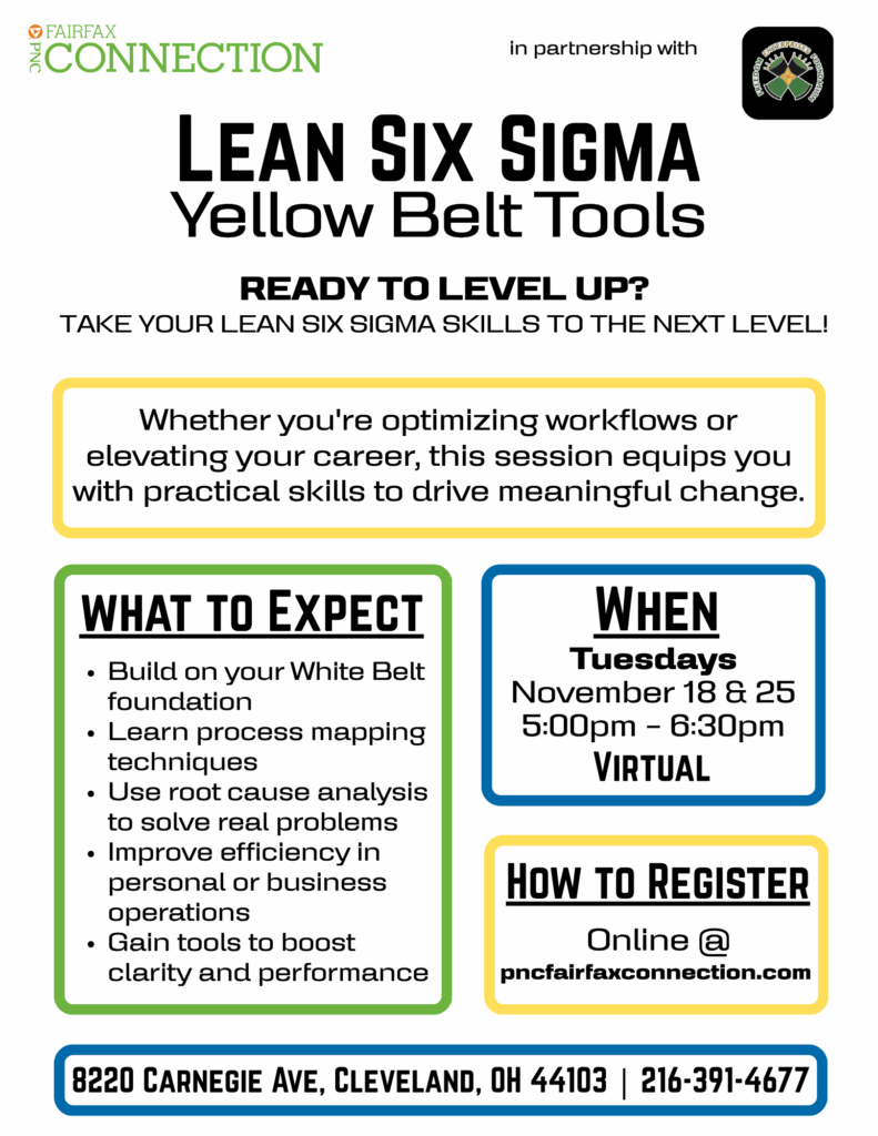 Ready to level up? This Yellow Belt Tools class picks up where the Lean Six Sigma White Belt left off. You’ll build on your foundation with hands-on tools like process mapping and root cause analysis to enhance your personal or business operations with greater efficiency and clarity.