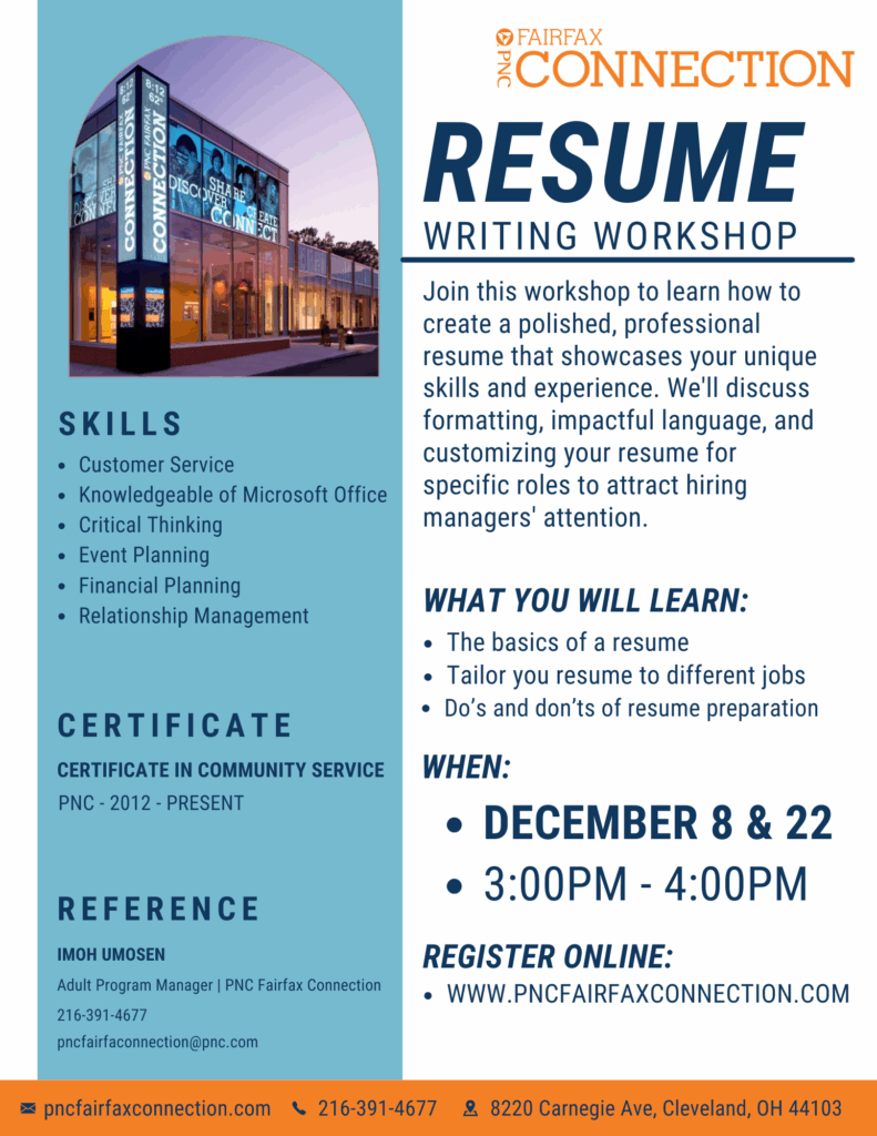 In this workshop, learn how to create a polished, professional resume that highlights your unique skills and experience. We’ll cover tips on formatting, powerful language, and tailoring your resume for specific roles. Join us to make your resume stand out and catch the eye of hiring managers!