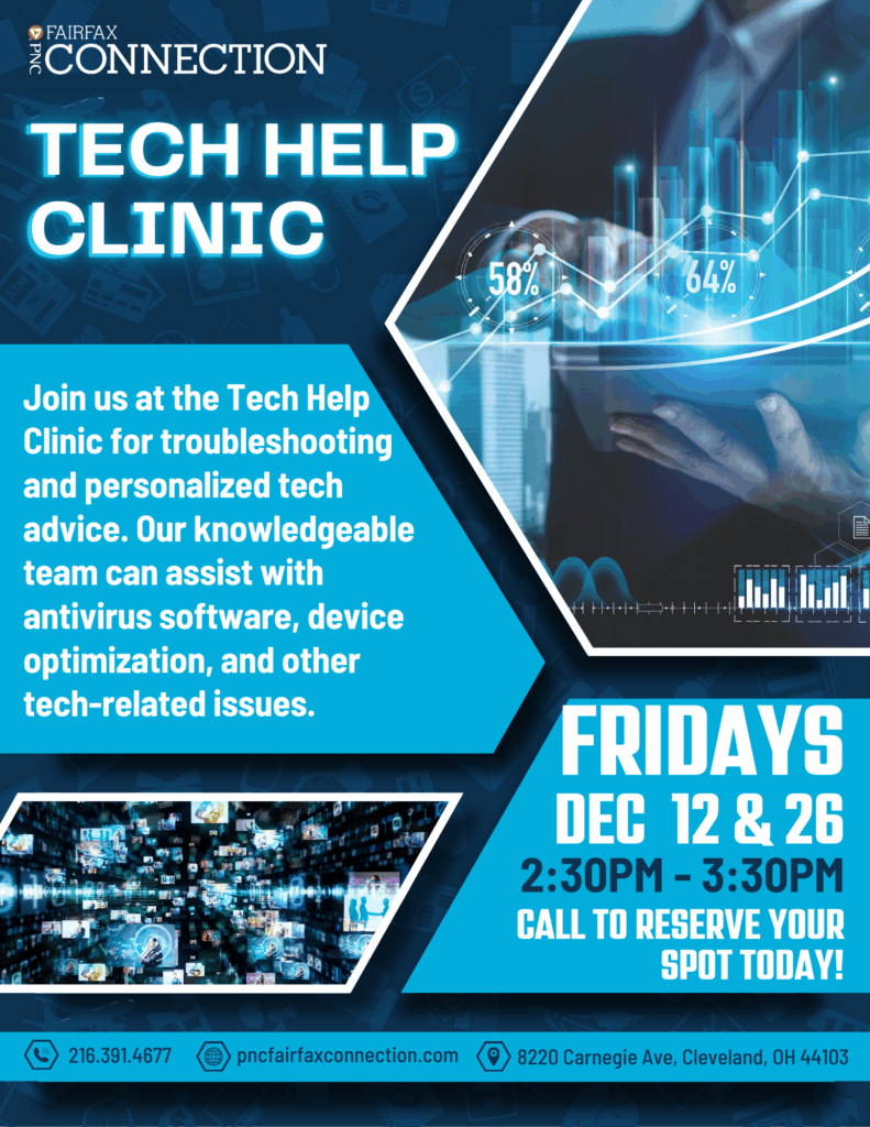 The PNC Fairfax Connection team is holding one-on-one appointments to assist members with troubleshooting devices, setting up software, device optimization, cybersecurity best practices, and connecting to community low-cost technology resources. An appointment is required.