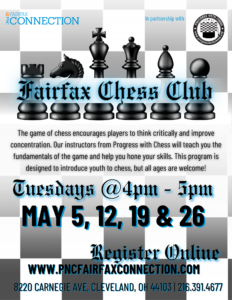 The game of chess encourages players to think critically and improve concentration. Our instructors from Progress with Chess will teach you the fundamentals of the game and help you hone your skills. This program is designed to introduce youth to chess but all ages are welcome.