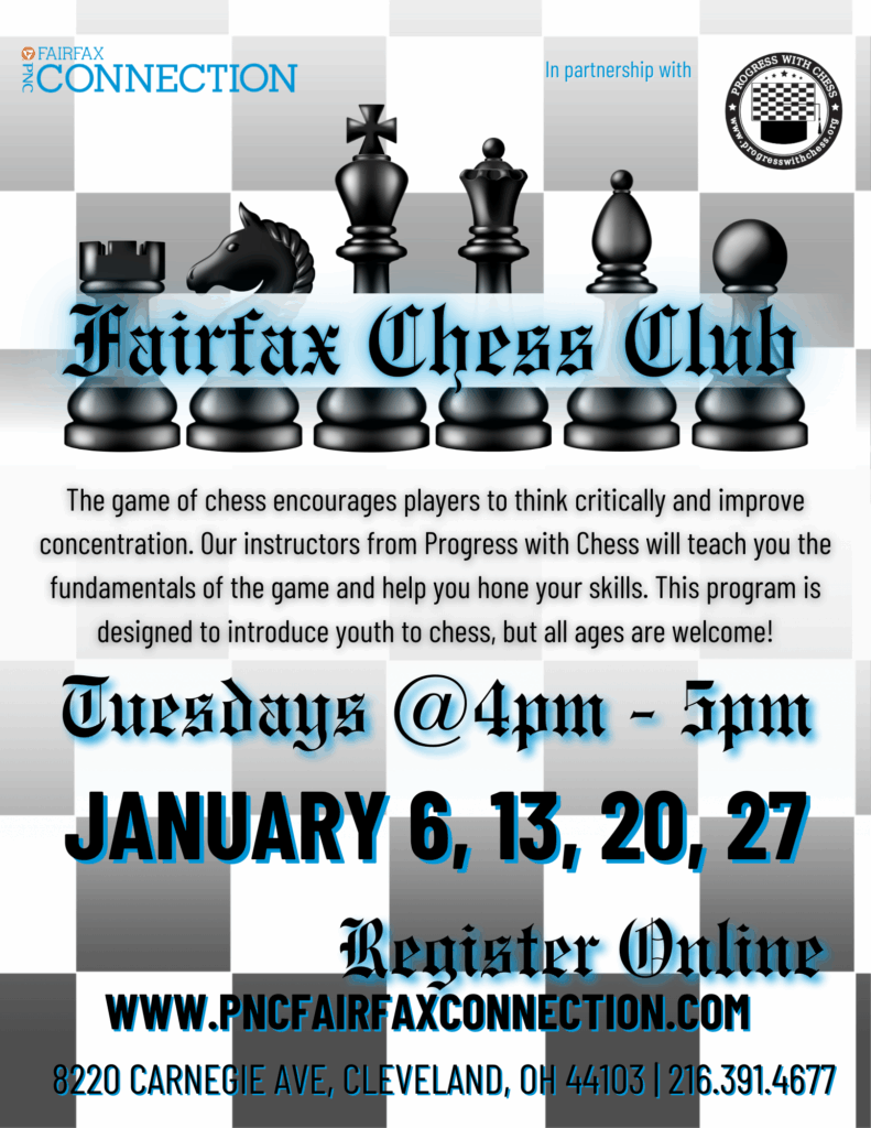 The game of chess encourages players to think critically and improve concentration. Our instructors from Progress with Chess will teach you the fundamentals of the game and hone your skills. This program is designed to introduce youth to chess, but all ages are welcome.