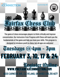 The game of chess encourages players to think critically and improve concentration. Our instructors from Progress with Chess will teach you the fundamentals of the game and help you hone your skills. This program is designed to introduce youth to chess, but all ages are welcome.